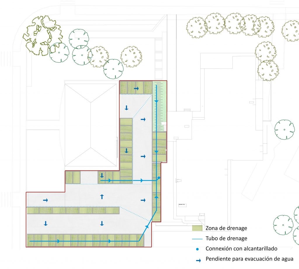 El projecte té 580 m2 de superfície drenant i 110 metres lineals de tub drenant que canalitzen l’aigua fins al sistema de clavegueram preexistent. El tub drenant del projecte està format per un tub principal, que connecta amb el clavegueram, i dos tubs auxiliars transversals al principal.