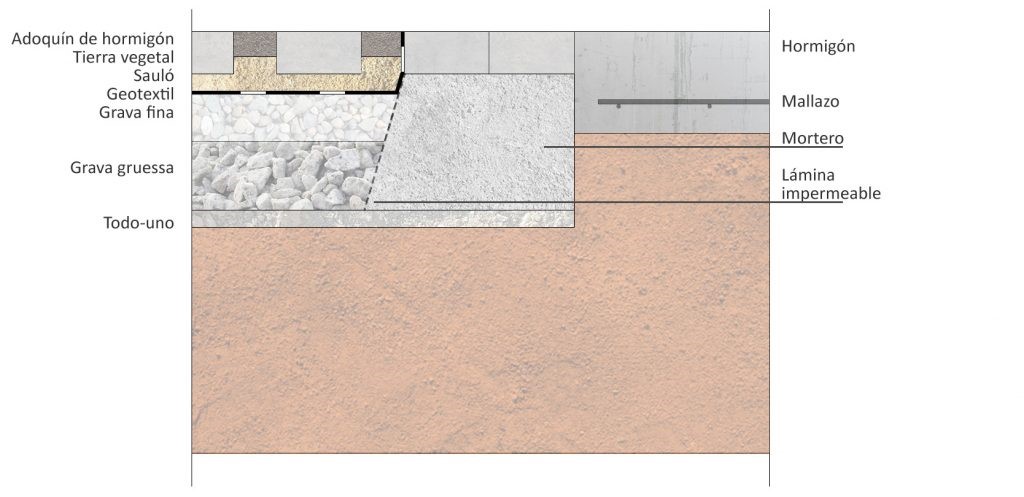 Paviment semi-tou està format per llambordes amb juntes de terra vegetal i vegetació amb una sub-base de va salar i paviment drenant format per dues capes filtrants: una de grava de cinc centímetres i una altra de granular d’emmagatzematge d’escolament de set centímetres amb capa geotèxtil damunt.