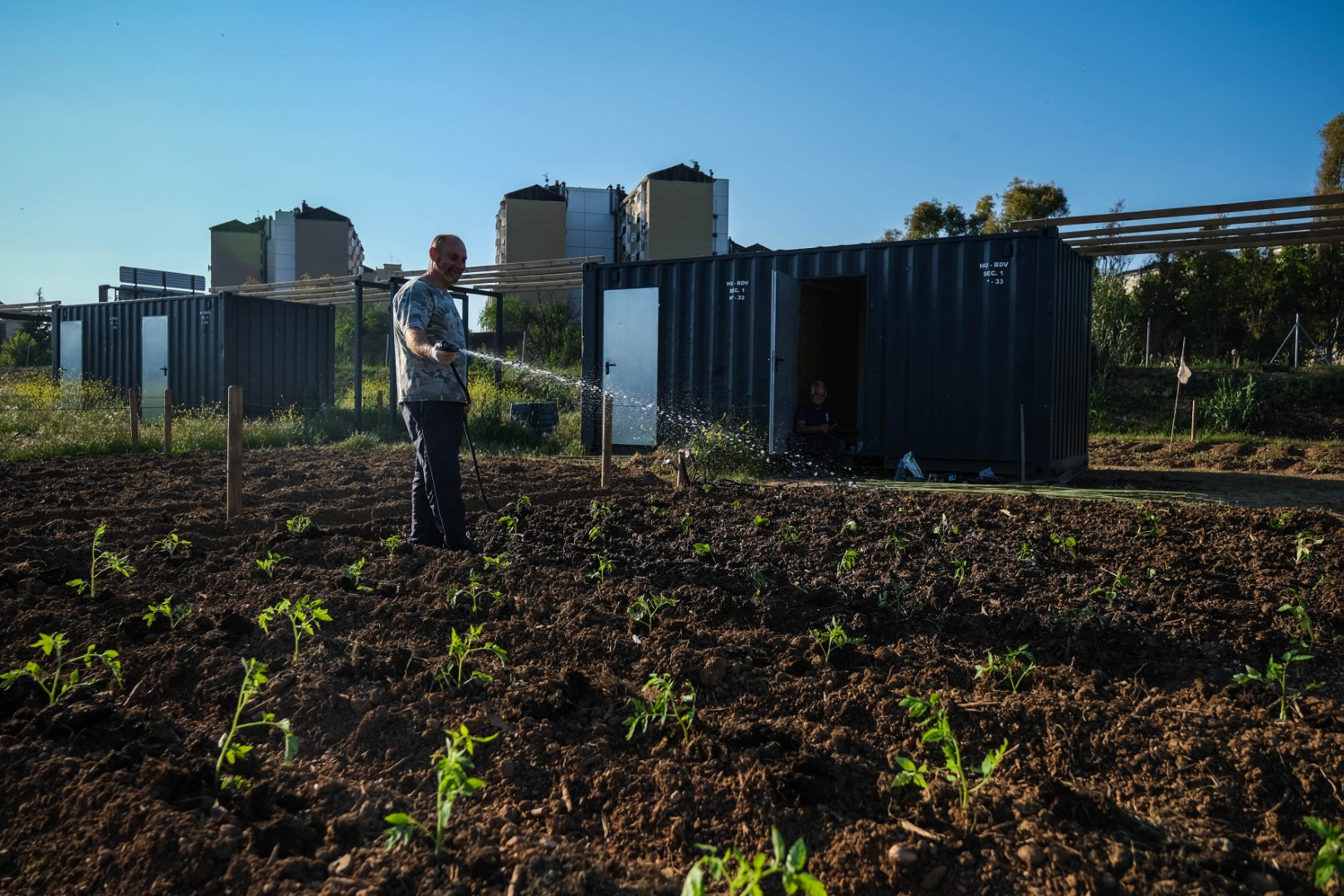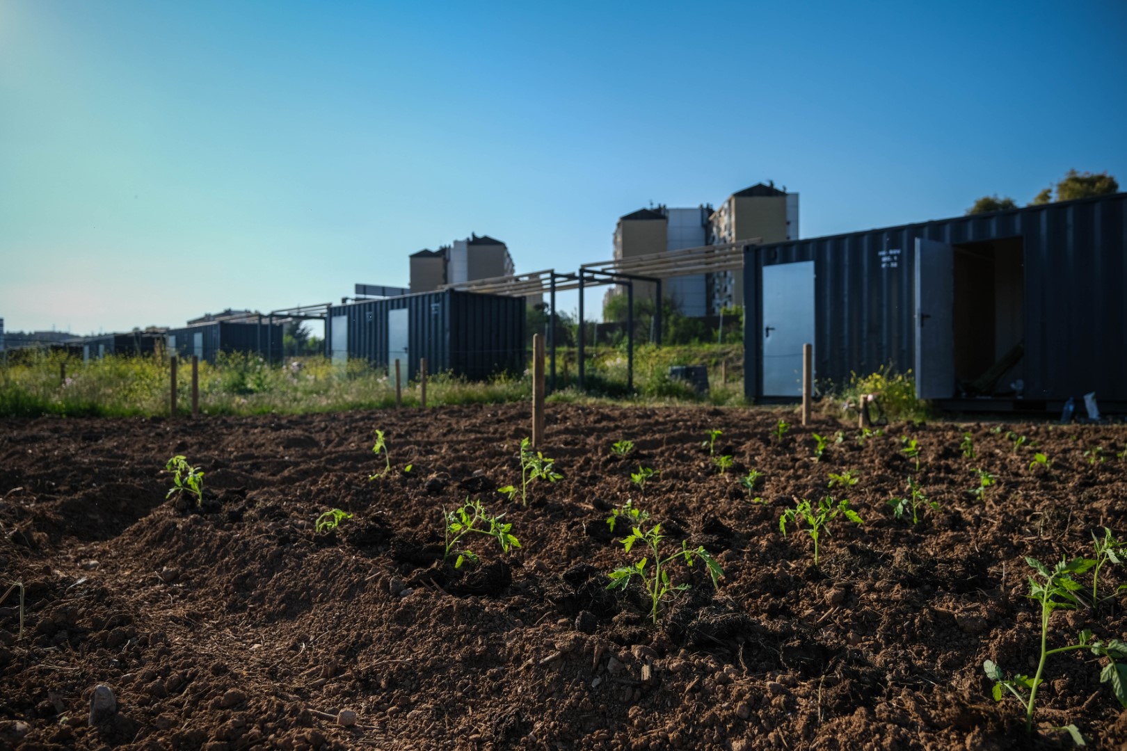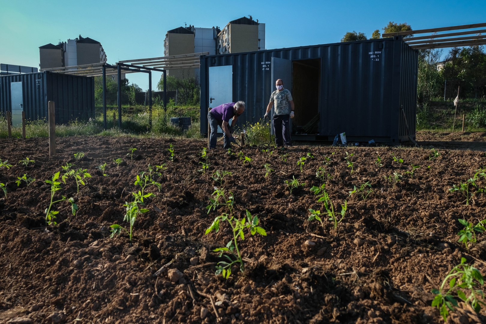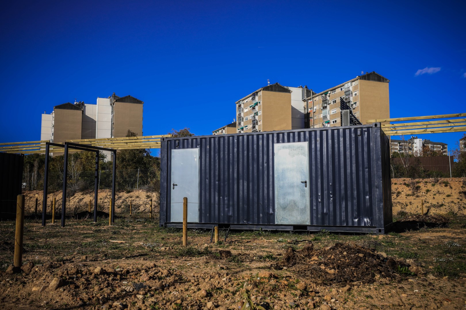 A nivell d’edificació, el projecte només consta d’unes petites casetes, que són contenidors marítim reciclats, que serveixen com a espai d’emmagatzematge de cada mòdul formada per quatre parcel·les d’horts i la zona de banys i espais de neteja. En el perímetre de la coberta se situen els canelons de PVC que recullen i canalitzen les aigües pluvials perquè puguin ser usades per a regar els horts.