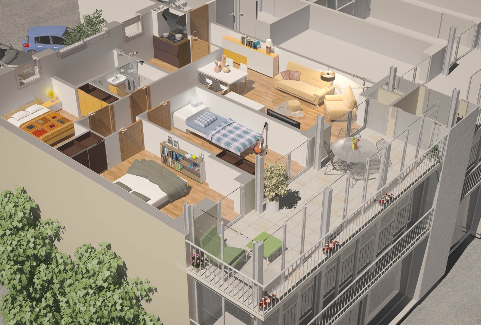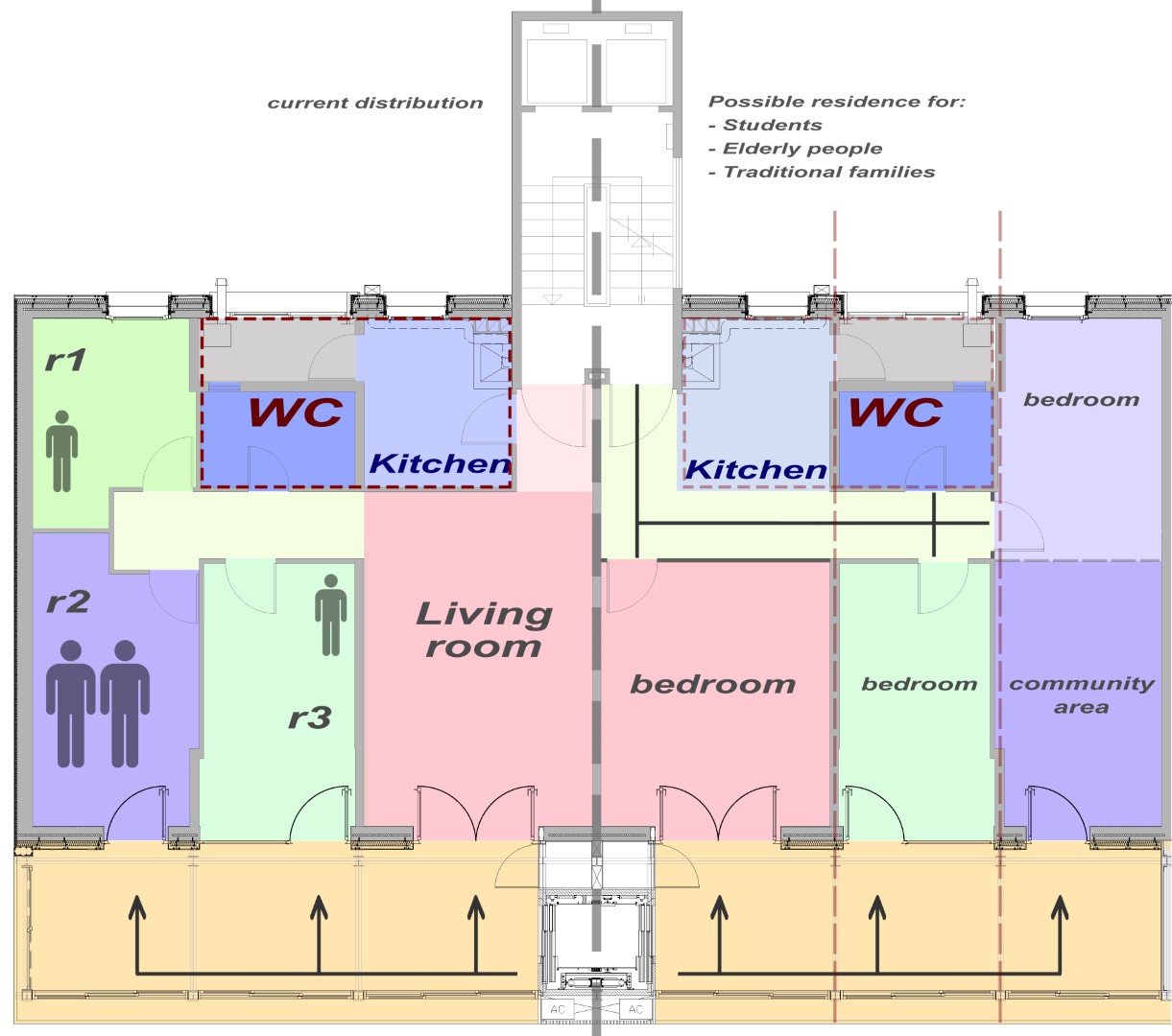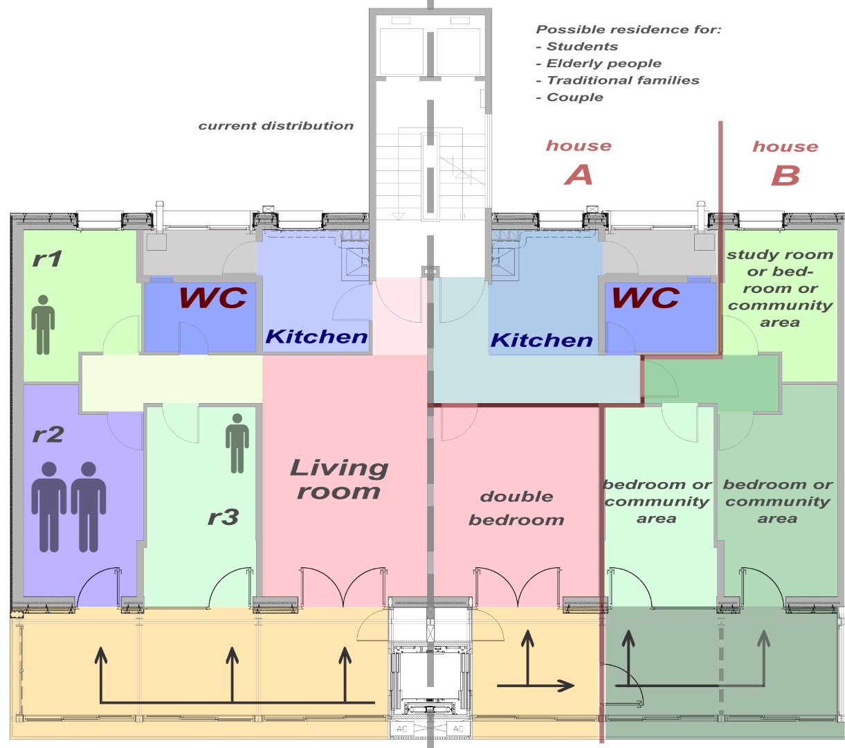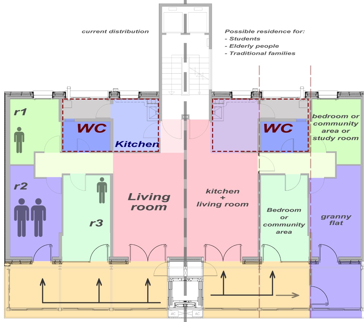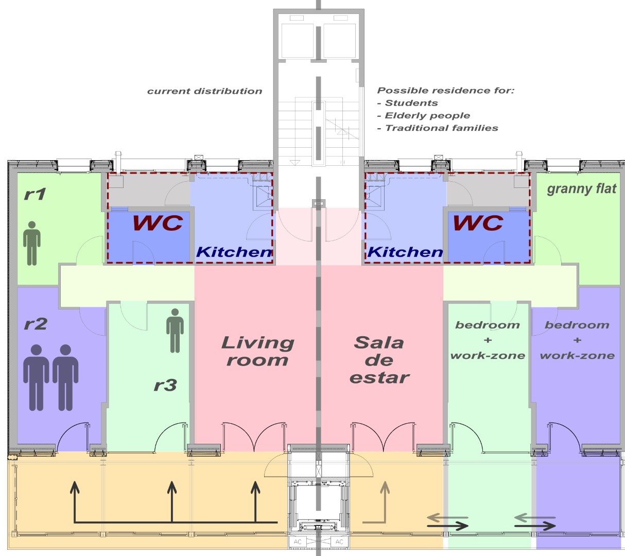 Aquest espai-extra intenta millorar l’accessibilitat i, al mateix temps, fer l’habitatge més flexible, en crear habitacions amb un accés independent es genera la possibilitat de tenir “granny flats”, que poden ser usats de diferents maneres, de manera que resulta atractiu apara diferents perfils d’usuaris.