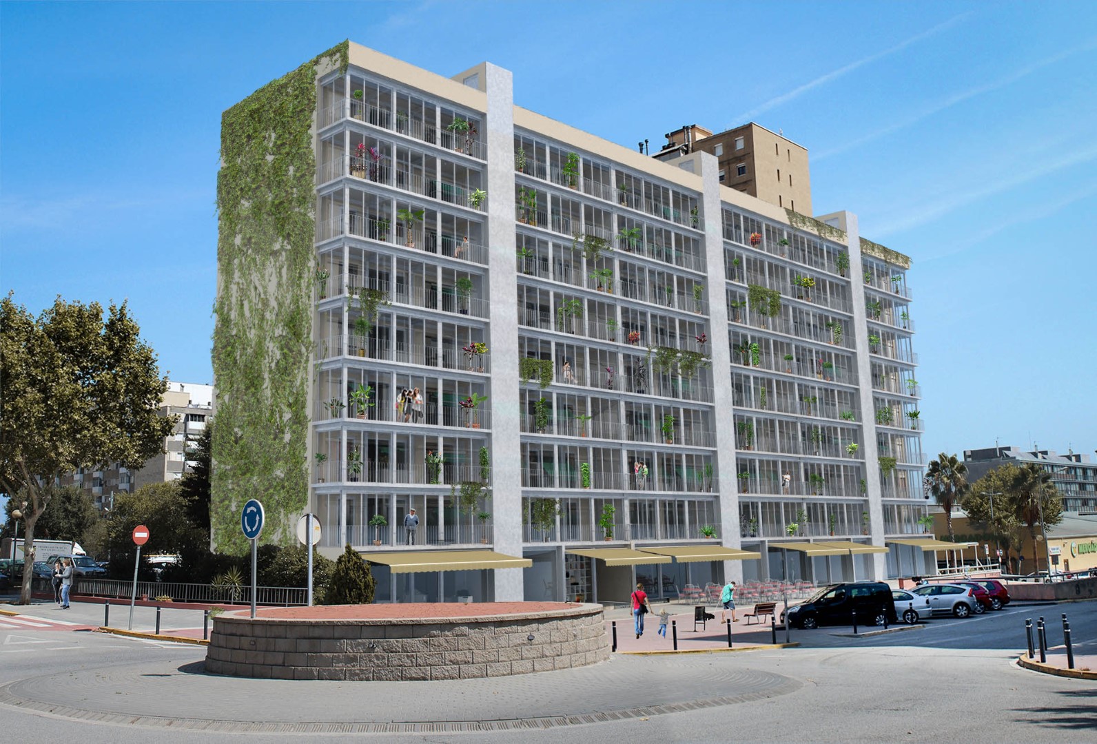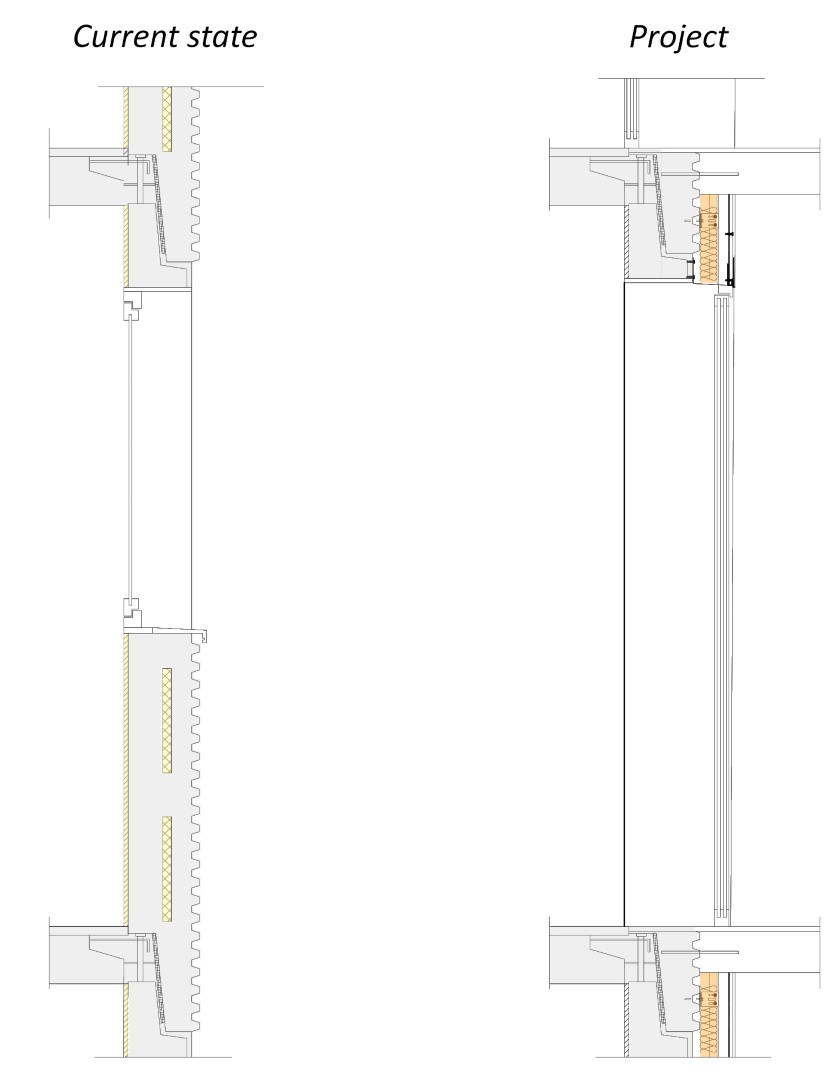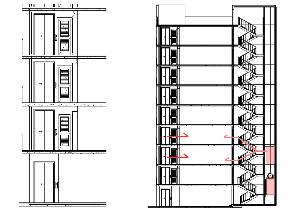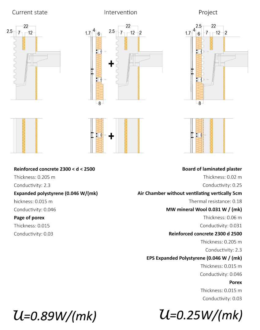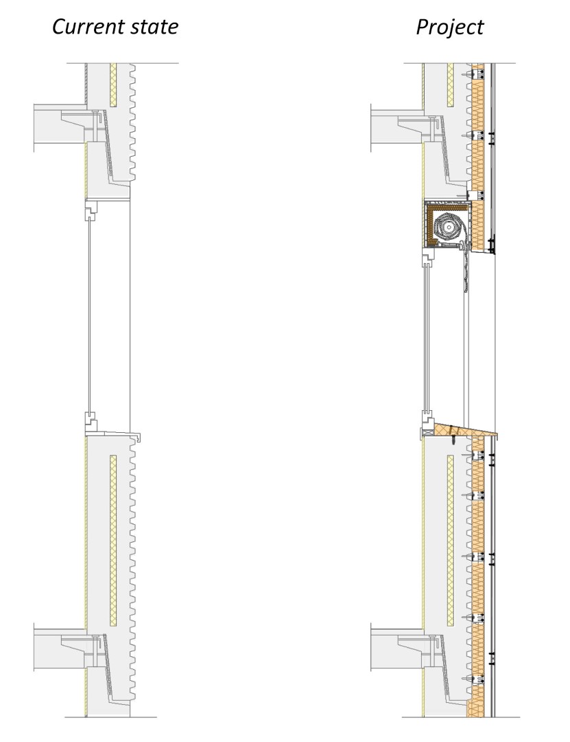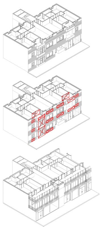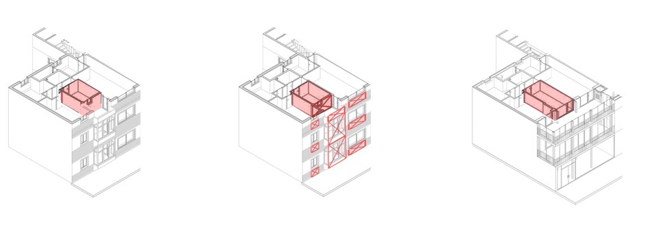 El projecte es basa en la construcció d’un espai-extra que funciona com a galeria bioclimàtica i un ascensor que genera un nou accés a través de dita galeria. L’ascensor es construeix centrat a la façana amb una galeria que garanteix l’accés a l’habitatge per tres punt diferents i que, al mateix temps, és útil com a espai d’aïllant tèrmic i captador de llum solar.