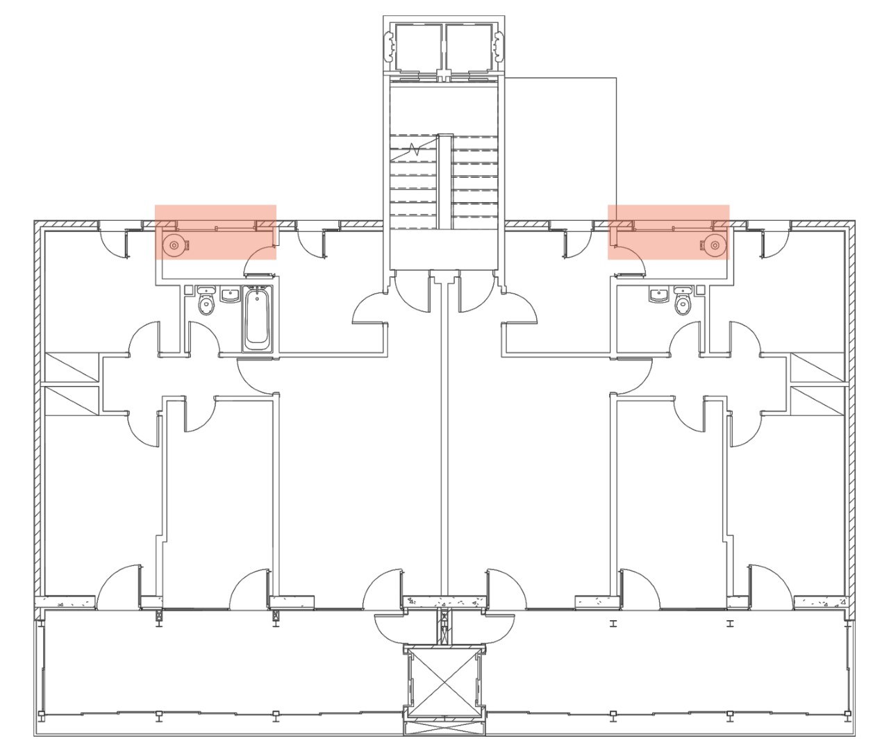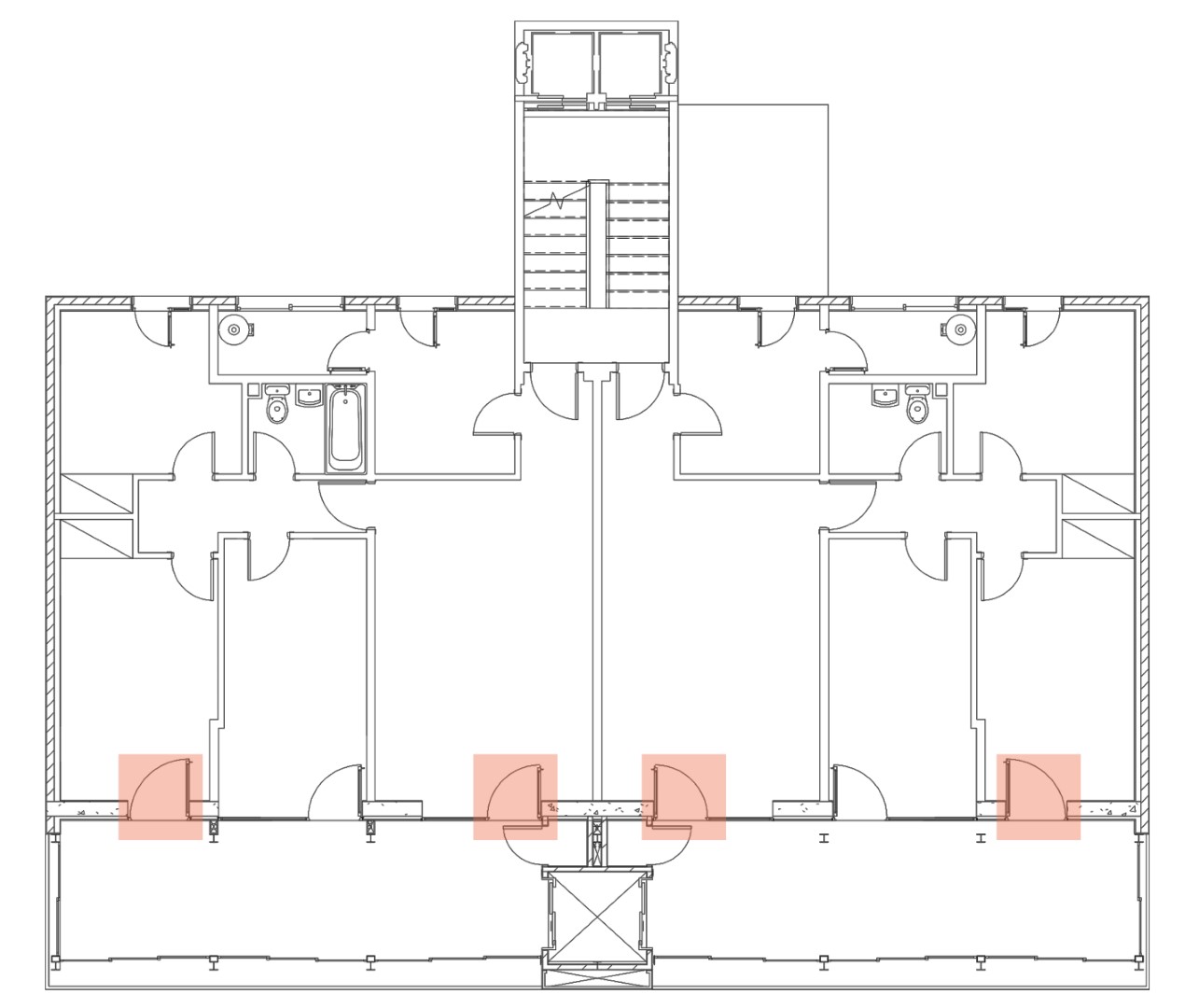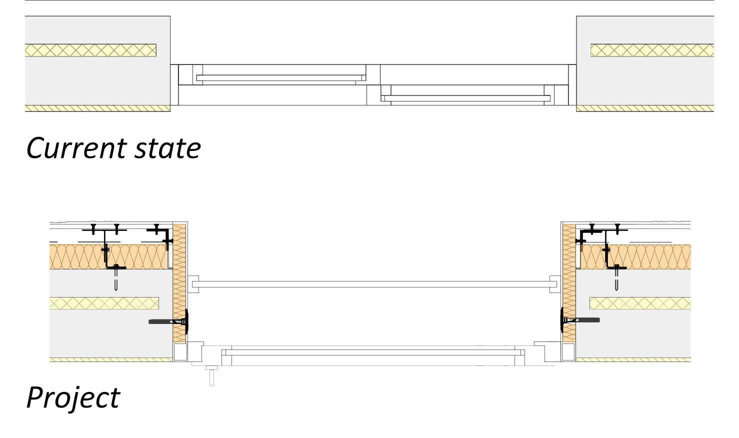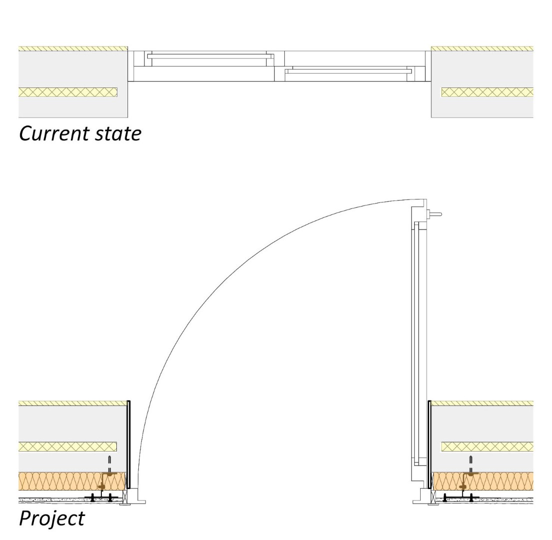 La galeria és una ampliació de 23m2 per habitatge, 46m2 per planta. Després d’haver construït les galeries, totes les finestres d’aquesta façana seran canviades per portes. Després d’això, les dues sales que estan en contacte amb la nova galeria tindran el seu propi accés. A part, en la façana preexistent s’instal·la un aïllant tèrmic de 8cm amb una cambra d’aire de 4cm.